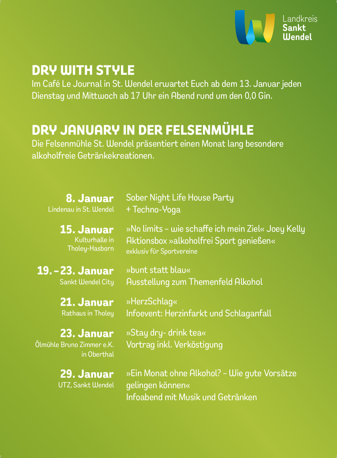 Der Dry January 2026 im Landkreis Sankt Wendel verspricht einen abwechslungsreichen Monat voller bewusster Genüsse, inspirierender Veranstaltungen und wertvoller Informationen – ganz ohne Alkohol. Unter dem Motto „4 Wochen (alkohol)frei – sei dabei!“ laden wir in Kooperation mit dem Landkreis herzlich zu einer Reise mit spannenden Events und kulturellen Highlights ein.
