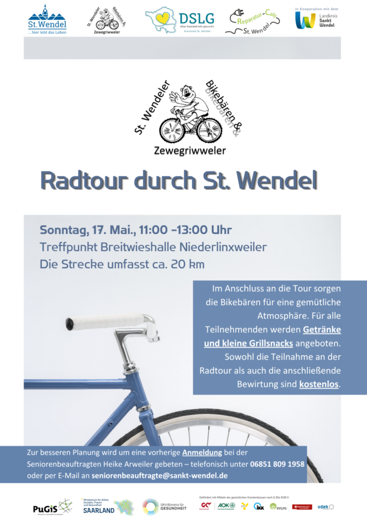 Die Seniorenbeauftragte der Kreisstadt St. Wendel und »Das Saarland lebt gesund!« laden ganz herzlich am Sonntag, den 17. Mai, zu einer gemeinsamen Radtour mit den Bikebären durch das St. Wendeler Land ein. In einem angenehmen Tempo können auch Anfänger oder Wiedereinsteiger auf der ca. 20 km langen Strecke problemlos mithalten. Wann? 17. Mai, 11–13 UhrTreffpunkt: […]