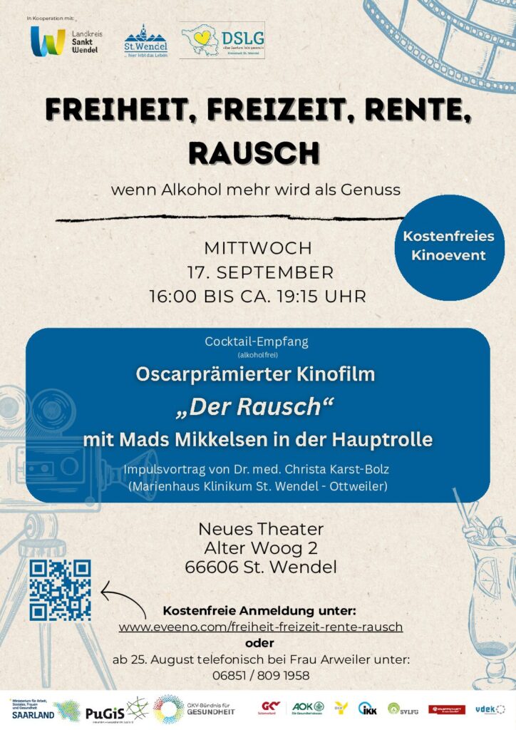 Am 17. September 2025 laden der Landkreis Sankt Wendel, die Stadt St. Wendel und das Netzwerk „Das Saarland lebt gesund!“ zu einem kostenfreien Kino-Event mit dem oscarprämierten Film „Der Rausch“ mit Mads Mikkelsen in der Hauptrolle ein. Das Event startet mit einem Cocktail-Empfang in der alkoholfreien Variante, da die Veranstaltung unter dem Motto „Alkoholprävention“ steht. […]