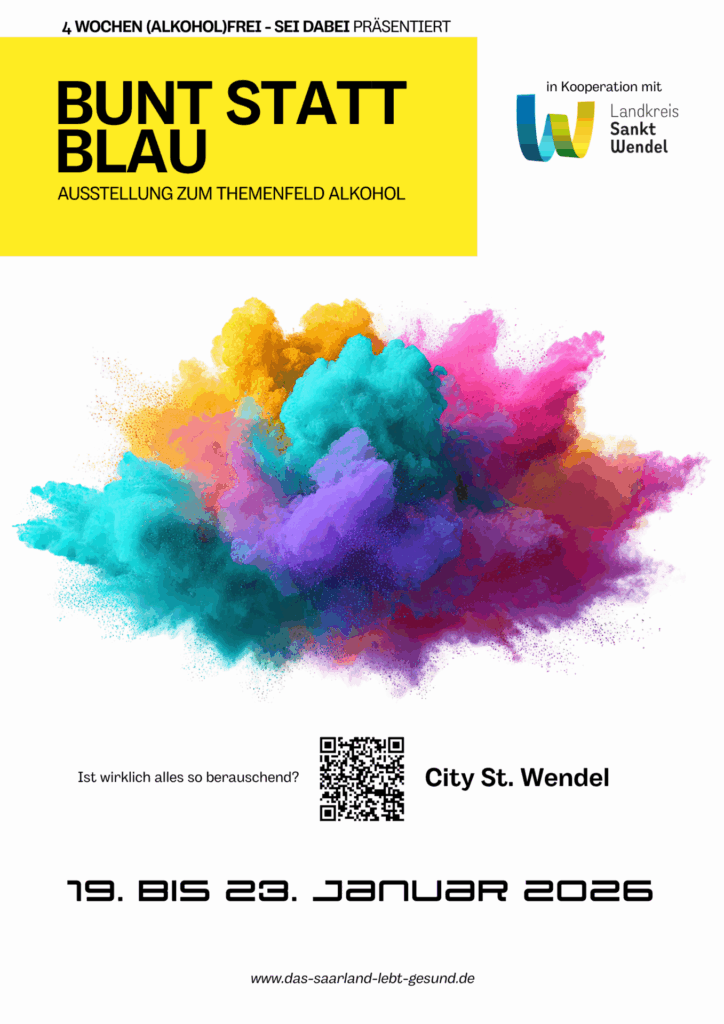 Vom 19. bis 23. Januar erwartet Sie in der Sankt Wendeler Altstadt eine besondere Austellung zum Themenfeld Alkohol. Im Zuge der Kampagne „4 Wochen (alkohol)frei – sei dabei“ rückt der Landkreis unter anderem mit der Wanderausstellung „Bunt statt Blau“ diverse Aspekte des Alkoholkonsums, des Alkoholverzichtes und Möglichkeiten des Alternativgenusses in den Mittelpunkt. Die Austellung wird […]