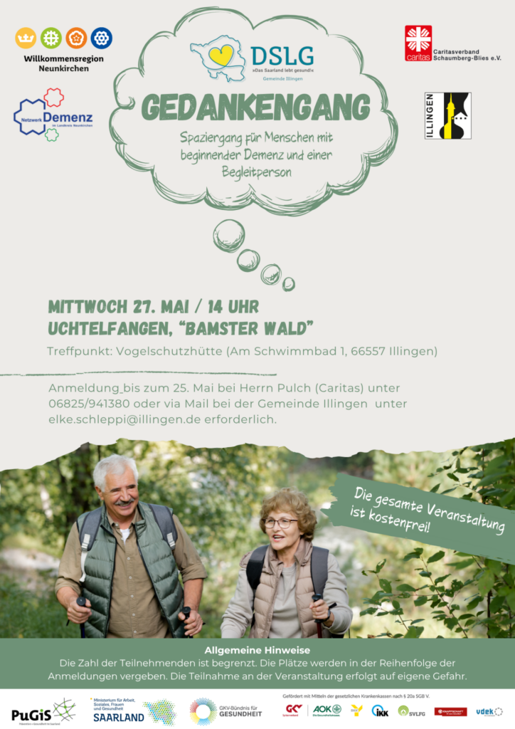 Am 27. Mai 2026 findet in Illingen-Uchtelfangen der DSLG-GedankenGang statt. Gemeinsam machen wir einen Spaziergang durch den Bamster Wald. Ergänzt wird der Spaziergang durch Achtsamkeits- und Bewegungsübungen. Im Anschluss an den Gedankengang können sich die Teilnehmenden bei Kaffee und Kuchen noch austauschen. Der Gedankengang richtet sich an Menschen mit Demenz und ihre Begleitperson. Treffpunkt ist […]