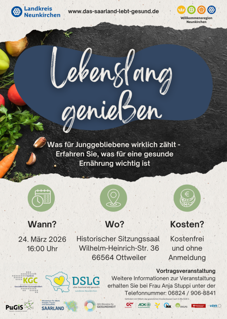 Gesund und genussvoll älter werden – wie das gelingt, zeigt ein kostenfreier Vortrag des Landkreis Neunkirchen in Kooperation mit Das Saarland lebt gesund! (DSLG) und der Koordinierungsstelle Gesundheitliche Chancengleichheit Saarland.Im Vortrag „Lebenslang genießen – Was für Junggebliebene wirklich zählt“ erfahren Interessierte, wie eine ausgewogene und angepasste Ernährung die Gesundheit stärkt und die Lebensqualität nachhaltig verbessert. […]