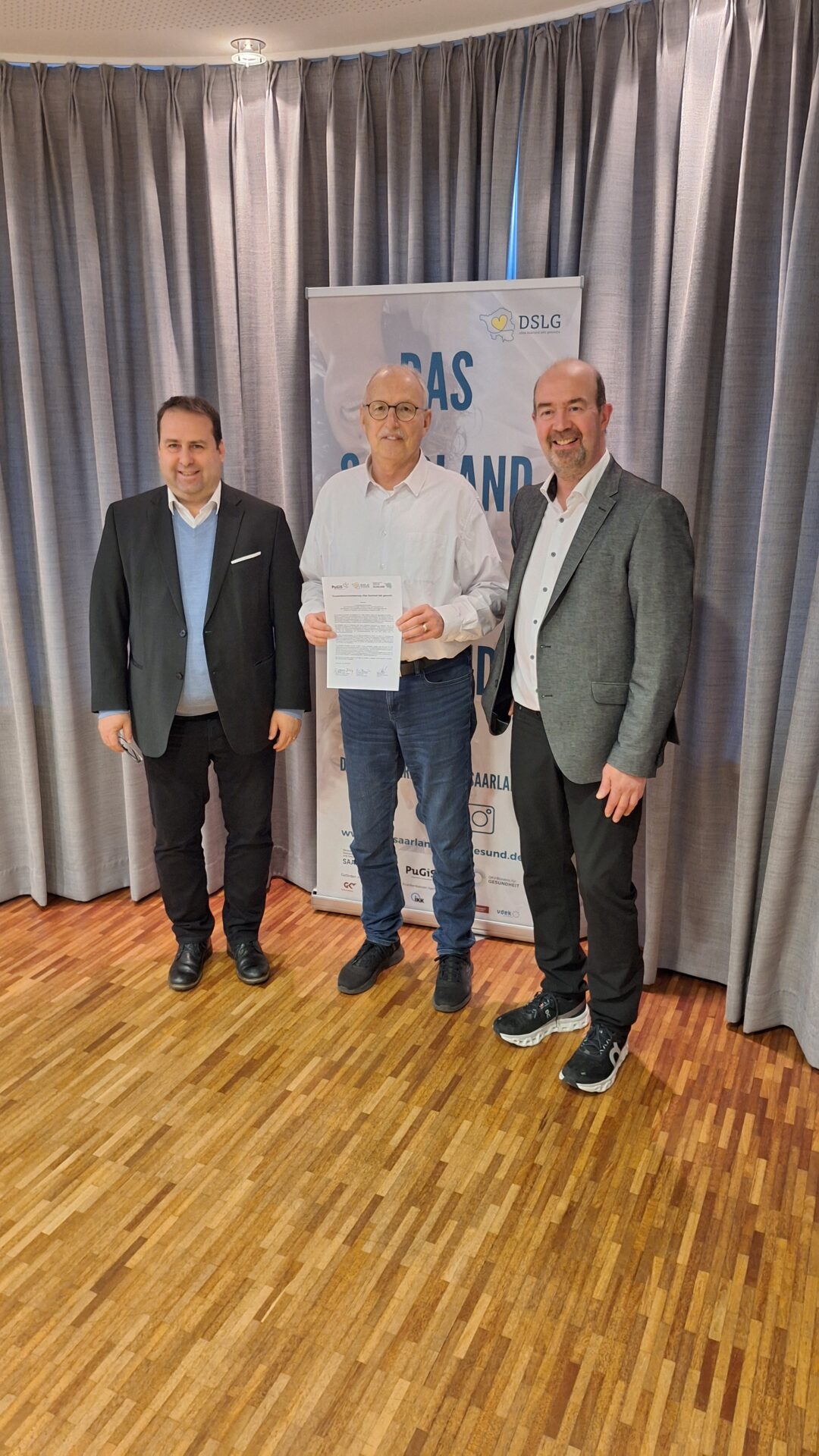 Zur offiziellen Unterzeichnung kamen Magnus Jung, Minister für Arbeit, Soziales, Frauen und Gesundheit, sowie Franz Josef Barth, Bürgermeister der Gemeinde Nonnweiler, zusammen. Gemeinsam mit Michael Keck, dem 1. Vorsitzenden des Vereins für Prävention und Gesundheit im Saarland (PuGiS e. V.), besiegelten sie die Zusammenarbeit.