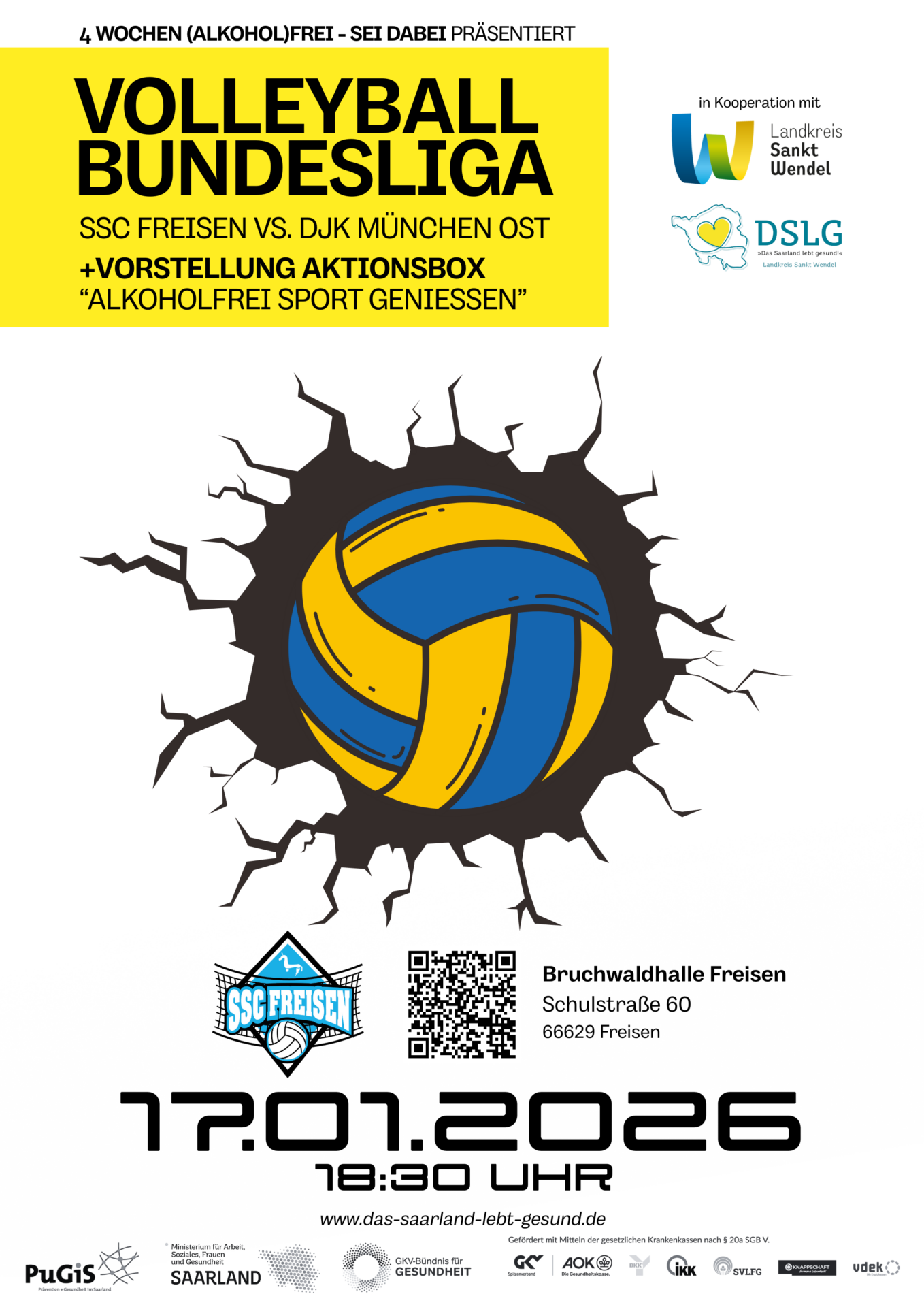 Erleben Sie Spitzensport live und setzen Sie gleichzeitig ein Zeichen für einen bewussten Lebensstil! Beim Frauen-Volleyball-Bundesliga-Spiel SSC Freisen vs. DJK München Ost erwartet Sie neben spannender Action in der Bruchwaldhalle Freisen, auch die Aktionsbox „Alkoholfrei Sport genießen“. Die Box bietet vielfältige Materialien für eine alkoholfreie Veranstaltung – von Werbebannern über Jugendschutz-Poster bis hin zu einem Rezeptheft mit alkoholfreien Cocktails, Mess- und Trinkbechern und vielem mehr, um gemeinsam einen gesunden, verantwortungsvollen Sportalltag zu gestalten.