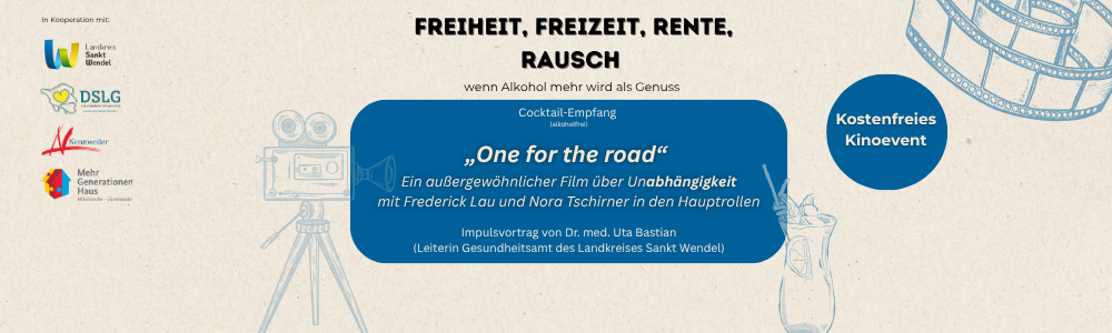 Diesen Fragen möchten wir gemeinsam mit Ihnen im Rahmen einer besonderen Veranstaltung mit dem Film „One for the road“ mit Frederick Lau und Nora Tschirner in den Hauptrollen nachgehen. Im Anschluss laden wir Sie zu einem Impulsvortrag von Frau Dr. med. Uta Bastian ein (Leiterin des Gesundheitsamtes des Landkreis Sankt Wendel), die das Thema aus medizinischer Sicht beleuchtet.