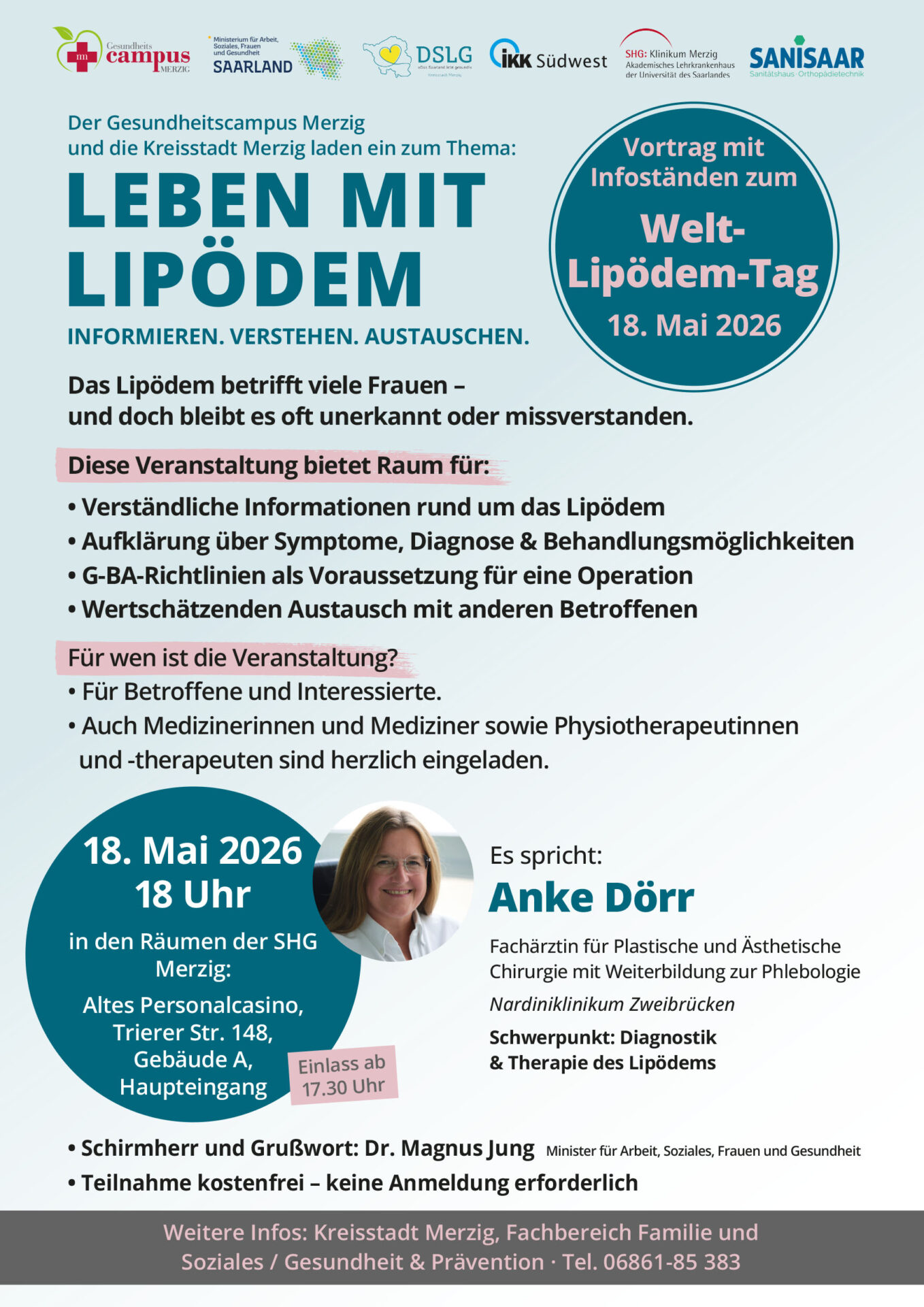Es spricht: Anke Dörr, Fachärztin für Plastische und Ästhetische Chirurgie mit Weiterbildung zur Phlebologie (Venenheilkunde), Nardiniklinikum Zweibrücken. Schwerpunkt: Diagnostik & Therapie des Lipödems.