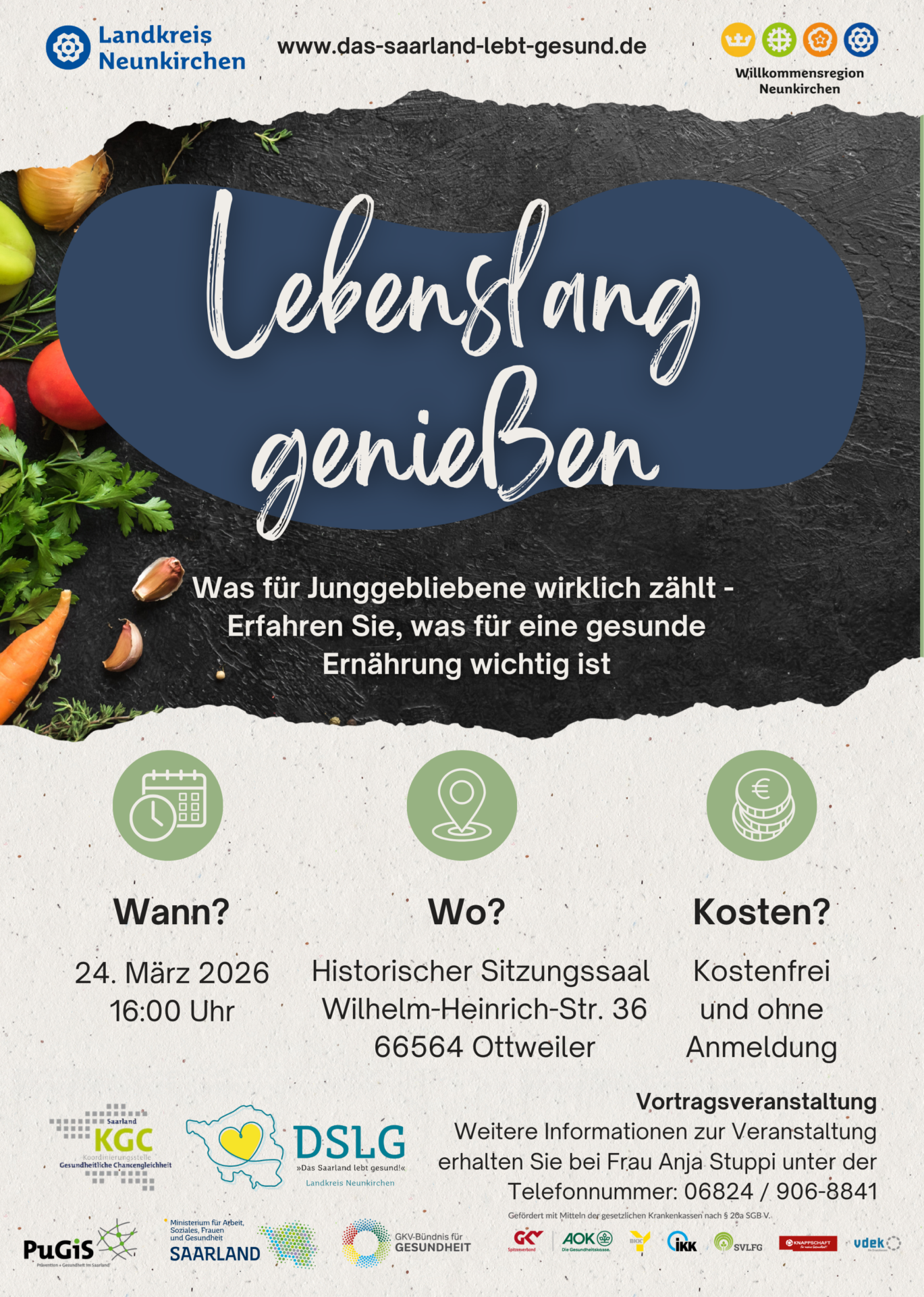 Gesund und genussvoll älter werden – wie das gelingt, zeigt ein kostenfreier Vortrag des Landkreis Neunkirchen in Kooperation mit Das Saarland lebt gesund! (DSLG) und der Koordinierungsstelle Gesundheitliche Chancengleichheit Saarland.
