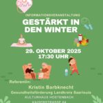 - 29Vortrag zu Krebsvorsorge, Diagnose & Begleitung bei Krebs16:00Die Frauenselbsthilfe Krebs e.V. lädt in Kooperation mit der Kreisstadt Merzig, dem Gesundheitsamt Merzig und dem Verein PuGiS e. V. (Prävention und Gesundheit im Saarland), am Mittwoch, 29.10.2025, um 16 Uhr zu einer Vortragsreihe ein mit den Themen Krebsvorsorge, Diagnose und Begleitung bei Krebs. Frau Dr. Ang , ...HerzSchlag Namborn – Informationsabend Herzinfarkt und Schlaganfall17:30 - 19:00Am 29. Oktober sind wir mit der HerzSchlag-Kampagne in Namborn. Zusammen mit dem Lankreis Sankt Wendel unseren kommunalen Vertreterinnen in Namborn möchten wir auch hier wieder für mehr Aufklärung in den Themen Herzinfarkt und Schlaganfall sorgen. Es wird zwei spannende Vorträge geben, nach denen es Gelegenheit für ein , ...Gestärkt in den Winter17:30 - 18:30Wenn die Tage kürzer werden und die Temperaturen sinken, ist es besonders wichtig, Körper und Geist auf die Herausforderungen des Winters vorzubereiten. Erkältungen, trockene Luft und Bewegungsmangel setzen unserem Immunsystem in dieser Jahreszeit besonders zu – doch mit der richtigen Ernährung und gezielten Maßnahmen , ...